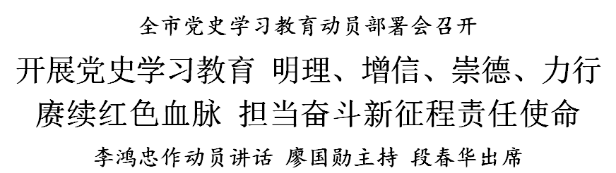 3月1日上午,全市党史学习教育动员部署会在天津礼堂召开,认真学习贯彻习近平总书记在党史学习教育动员大会上的重要讲话精神,对我市开展党史学习教育进行动员部署。市委书记李鸿忠出席并作动员讲话,市委副书记、市长廖国勋主持并传达习近平总书记重要讲话精神,市人大常委会主任段春华出席。